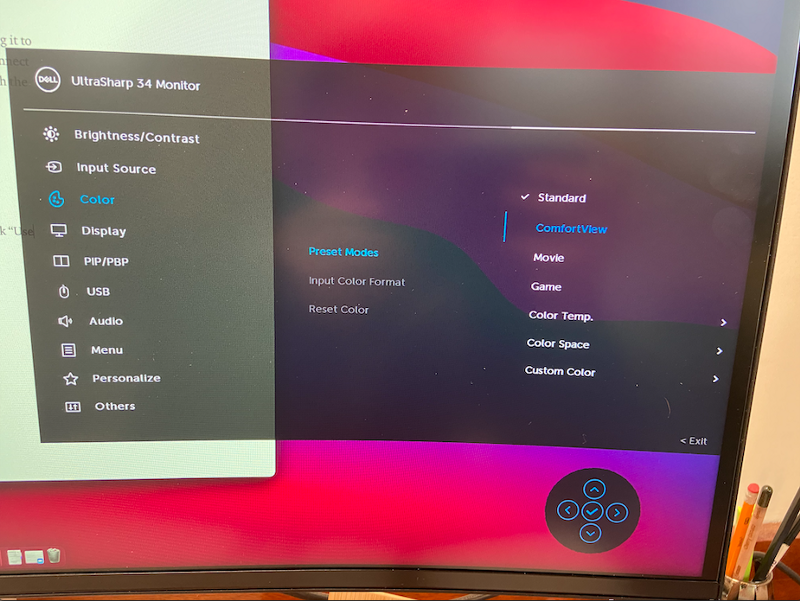 2. The second way is to use the monitor menu, select Color and under Preset Modes, select anything but Standard and it should remove the halo. Find one that is comfortable for you and select it.
